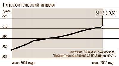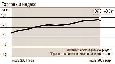 Торговый индекс на фоне остальных индексов выглядел не так плохо и в июне вырос на 0,6%. Оборот розничной торговли в мае 2005 года составил 549,8 млрд руб., что на 13,3% больше, чем в соответствующий период 2004 года, а в январе–мае – 2581,6 млрд руб. (рост – 11,0%). Тем не менее стабильно высокий спрос на импортную продукцию, благодаря которому процветает торговля, пугает наших производителей.