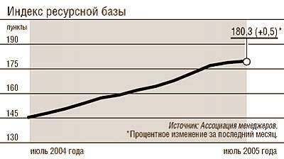 Индекс ресурсной базы вырос всего на 0,5%. Положительная динамика индекса отражает высокий уровень цен на товары российского экспорта на мировых рынках (прежде всего нефть, нефтепродукты и газ). И эта тенденция, видимо, сохранится. ОПЕК в июне повысила прогнозы спроса на нефть на третий и четвертый кварталы этого года с 28,93 млн. до 29,08 млн. баррелей в день и с 30,53 млн. до 30,61 млн. баррелей в день соответственно. Во многом рост цен на нефть вызывается нехваткой производственных мощностей по ее переработке (загрузка перерабатывающих мощностей в Европе и США уже достигает 95%) и ограничениями на стороне предложения сырой нефти. В результате Merrill Lynch повысил прогноз средней цены нефти марки Brent в 2005 году с $45 до $49 за баррель. Однако высокие цены на нефть все в меньшей степени способны оказывать благоприятное воздействие на российскую экономику. Так, Минэкономразвития снизило свой прогноз добычи нефти в России в 2005 году на 10 млн. тонн – до 475 млн. тонн.