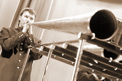 Начать с акустики. Хотя после ремонта БКЗ областной филармонии несколько прибавил в качестве звука, всё же это по-прежнему – не зал для акустических инструментов. Грустно, но это так. Однако роговой оркестр – это именно то звучание, которому не страшен даже такой зал. Громкие и стройные инструменты, на воде слышные за несколько вёрст, в нашем, собранном из ДСП и укутанном плюшем, зале совершенно не потерялись бы и без всякой подзвучки. Впрочем, микрофоны зачем-то всё же выставили и подключили, но естественное звучание всё-таки превалировало – это радовало.