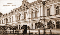 | Землеустроительный техникум в Пскове был преобразован из землемерного училища, сохранил высокий уровень образования и даже дореволюционного директора – межевого инженера Евгения Васильевича Семёнова. Здание на улице Гоголя, 7 не сохранилось. |
