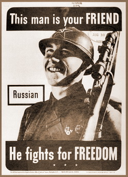 | Американский плакат периода Второй Мировой войны (1942 г.). Надписи гласят: «Этот человек – твой ДРУГ. Русский. Он борется за СВОБОДУ». |