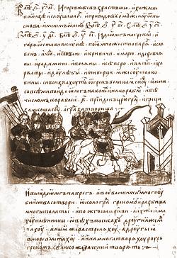 Приведем текст Радзивиловского списка под той же датой, что имеется в Ипатьевском, тем более, что есть возможность, благодаря факсимильному изданию, воспроизвести копию листа, где помещено летописное сообщение. Радзивиловская (Кенигсбергская) летопись - самая ранняя русская лицевая рукопись, содержащая 618 миниатюр. Она начинается текстом ПВЛ и завершается изложением событий 1205/1206 г. Название получено по имени владельцев (XVII в.), передавших ее в 1671 г. в Кенигсбергскую библиотеку. Считают, что миниатюры рукописи скопированы с более раннего иллюстрированного оригинала. Радзивиловская летопись в настоящее время хранится в Библиотеке Академии наук в Санкт-Петербурге.