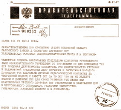 Заместитель губернатора Вера Емельянова (бывший начальник государственного управления образования области), на бланке правительственной телеграммы: «Вся трудовая деятельность коллектива – это доказательство глубокой и беззаветной преданности делу обучения и воспитания молодого поколения. Благодарю дружный педагогический коллектив за творческий подход к работе, за то, что вы не жалеете знаний и душевных сил для своих учеников. Желаю вам благополучия, крепкого здоровья, уверенности в завтрашнем дне и неиссякаемого оптимизма».