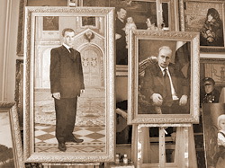 | Дмитрий Медведев (слева) и Владимир Путин (справа) смотрят на окружающий мир из позолоченых рам дорогих картин придворных художников. |