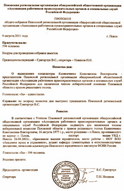 | Псковская региональная организация Ассоциации работников правоохранительных органов и спецслужб РФ единогласно поддержала кандидатуру Константина Калиниченко 594 голосами и двумя подписями. |