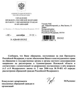 | Обращение инвалида Великой Отечественной войны М. К. Удалова направлено из администрации президента РФ в администрацию Псковской области. |