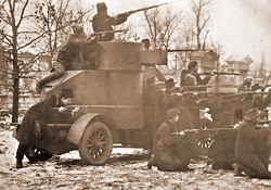 Великая Октябрьская социалистическая революция. Красногвардейцы у броневика «Лейтенант Шмидт», захваченного у юнкеров. Имя броневику дано красногвардейцами в честь героя революции 1905 г. в России. Петроград. 25 октября 1917 года. Фото: Пётр Оцуп