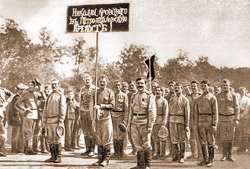 Демонстрация солдат Российской армии. 1917 год. Транспарант: «Николая Кровавого в Петропавловскую крепость».