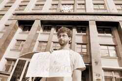 | Корреспондент радиостанции «Эхо Москвы» Тимур Олевский на пикете против закона о клевете возле здания Госдумы РФ. Фото: Антон Тушин / Ridus.ru |