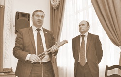 | Передача переходящего разводного ключа от Ивана Цецерского Игорю Чередниченко стала единственным моментом на сессии городской Думы, когда новый глава администрации города улыбнулся. Фото: Псковское агентство информации |