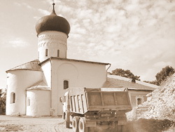 | Движение тяжелого транспорта около собора Рождества Богородицы. Июль 2012 г. Фото: Ирина Мельникова |