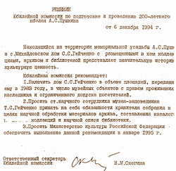 Решение Юбилейной комиссии по подготовке и проведению 200-летнего юбилея А. С. Пушкина от 6 декабря 1994 года.