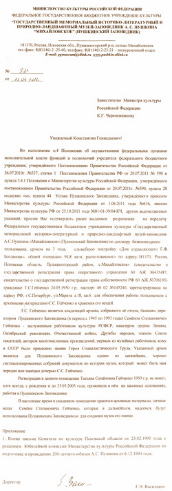 Письмо Пушкинского Заповедника в Министерство культуры Российской Федерации от 23.06.2012 года № 512.